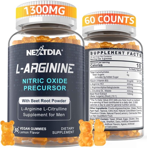 Sugar Free L Arginine Nitric Oxide Gummies 1300mg for Men & Women with L Citrulline, Beet Root, B3 | L Arginine L Citrulline Supplements | Vegan, 60 Counts