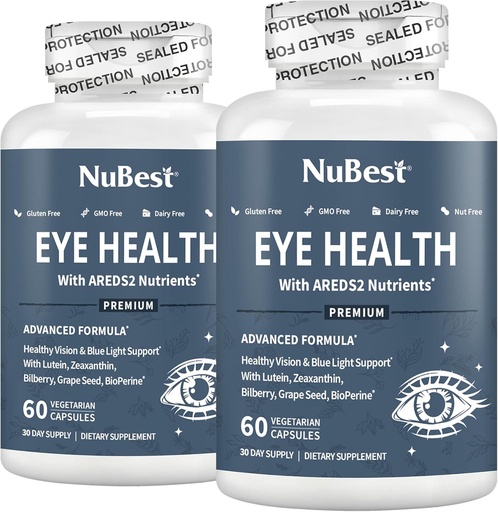 NuBest AREDS 2 Eye Vitamins with Beta Carotene Carrot Powder, 20mg Lutein, 4mg Zeaxanthin, Bilberry, Grape Seed, BioPerine, B-Complex, Multivitamin for Eye Health | Pack 2