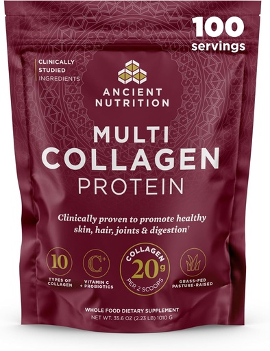 Ancient Nutrition Collagen Peptides Powder, Multi Collagen Protein, Women & Men, Vitamin C, Probiotics, Hydrolyzed Collagen, Supports Skin, Joints, Gut Health, Unflavored, 100 Servings
