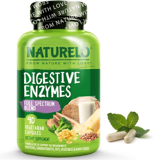 NATURELO Digestive Enzymes - Full Spectrum Support with a Broad Blend of 15 Enzymes Plus Ginger - 90 Vegan Capsules